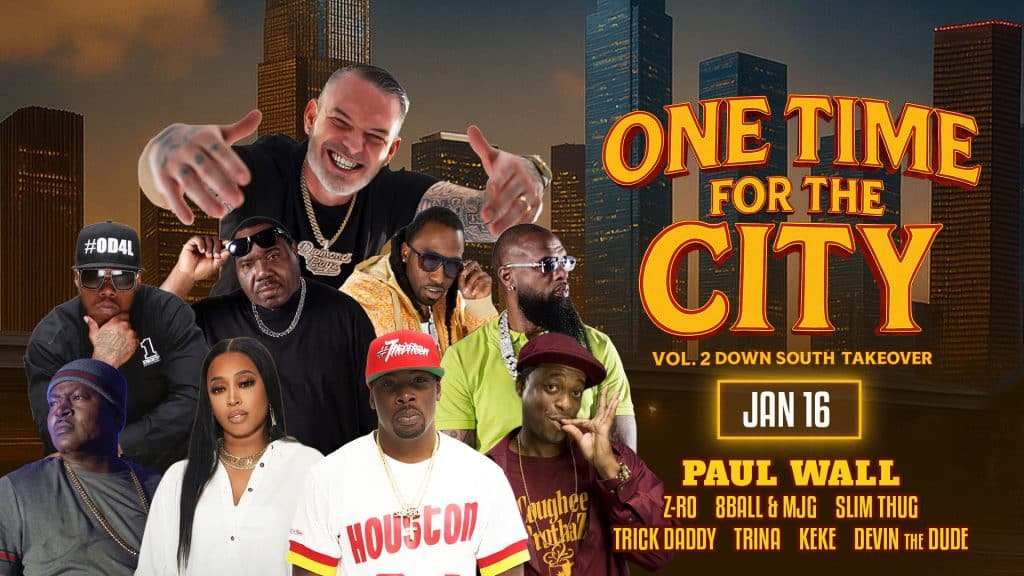 Experience the ultimate Southern hip-hop concert live at NRG Arena. One Time for the City unites legendary artists Paul Wall, Z-RO, 8Ball & MJG, Slim Thug, Trick Daddy, Trina, Keke, and Devin the Dude for one epic night of classic hits, bass-heavy beats, and Southern pride. Don’t miss this high-energy celebration of H-Town, Miami, and Dirty South culture — only at One Time for the City.